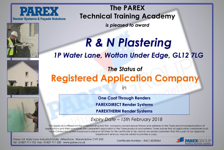 Hartley Plastering are proud to be recognised as an Official Parex Approved Application Company. This includes One Coat Through Renders, PAREXDIRECT Render Systems and PARAEXTHERM Render Systems. Our current licence runs until February 2018.